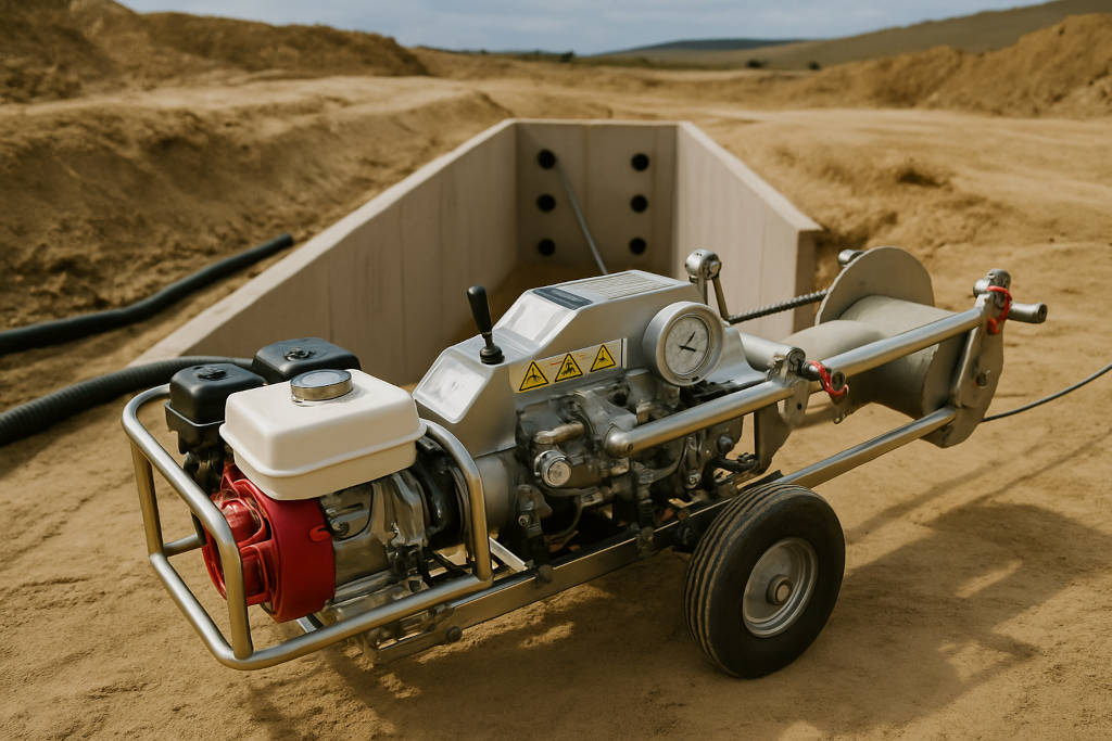 • Se preparará un conjunto de cepillo + giratorio + mandril que se conectará a esta cuerda piloto, y en el otro extremo de la zanja a mandrilar, estará el útil de esfuerzo de tiro, que podrá ser un cabrestante o personas.
